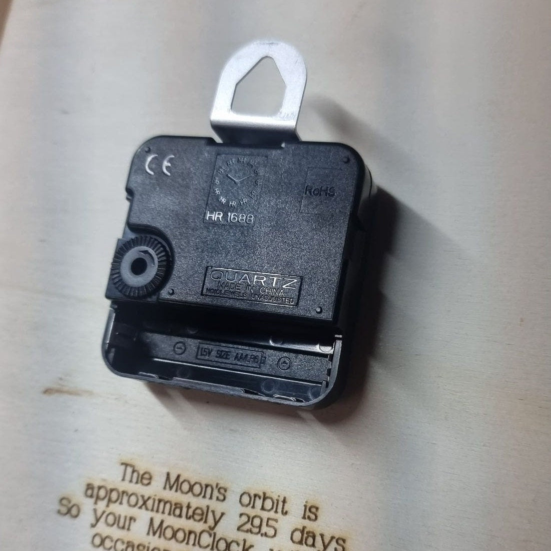 The single hand rotates clockwise and is driven by an accurate quartz movement, just like a regular clock, but it goes once round once every 29.5 days to closely match the phases of the moon, so your MoonClock will need occasional adjustment.