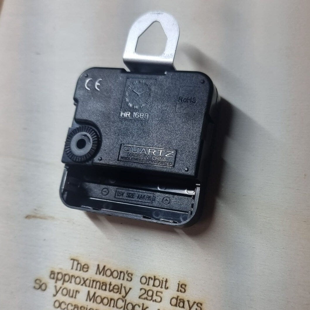 Your MoonClock is laser engraved into 4mm thick wood and measure 18cm by 18cm.